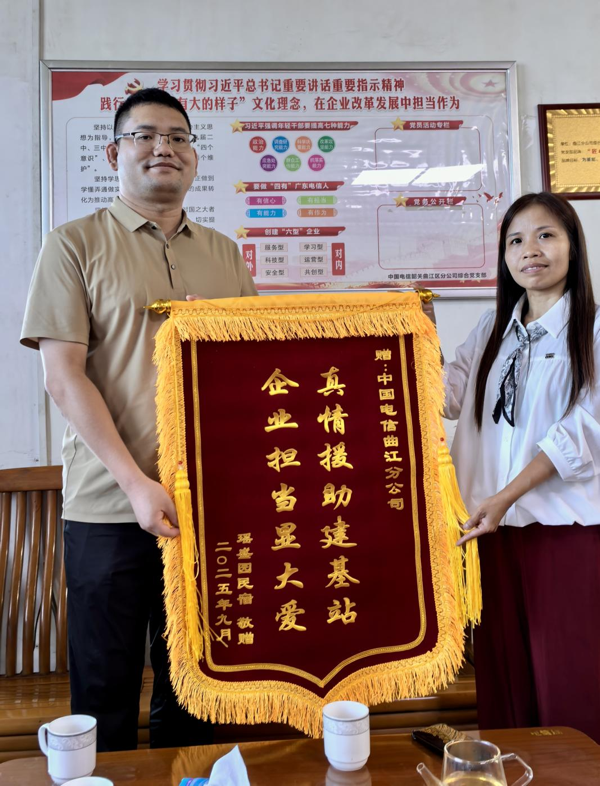 网络畅通了,客人多了,民宿红火了,民宿经营者邓秀平特地为中国电信送去了感谢锦旗!