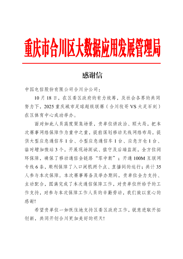 此次渝超赛事通信保障任务的圆满完成,不仅是中国电信合川分公司技术实力与服务能力的生动体现,更彰显了其“扎根合川、服务合川”的责任担当。未来,中国电信合川分公司将继续以卓越的网络技术与优质的信息化服务,担当区域发展的“数字基石”,为合川各类大型活动、城市建设、民生服务提供更坚实的通信支撑,与合川共同谱写高质量发展的绚丽篇章。