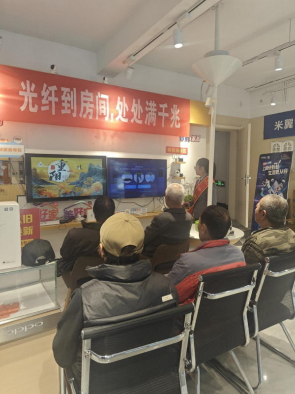 活动期间,营业厅精心布置“爱心翼站”专区,科学划分为互动礼品区、教学区与便民服务区,形成一站式适老化服务场景。入口处节日氛围浓厚,暖意融融,发热暖贴、保暖手套等实用礼品整齐摆放,迎接老人们的到来;教学区配备大屏演示设备,以图文并茂的形式简化智能手机操作教学; 便民服务区则贴心准备了老花镜、热饮及手机清洁等服务项目。老人们一步入厅内,便能感受到“进门即暖、全程无忧”的细致关怀。