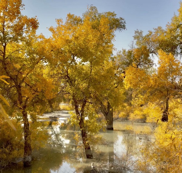不同于北疆的森林草原,准噶尔盆地的乌尔禾胡杨林展现着大漠的雄浑之美。九月至十月,30万亩胡杨褪去翠绿,化为金色火焰,与火红的红柳、蜿蜒的河流、奇特的雅丹地貌构成震撼画面。清晨时分,阳光透过胡杨枝叶洒下斑驳光影;黄昏时,落日为胡杨镀上金边,整片林区宛如燃烧的火海,诠释着“千年不死、死后千年不倒、倒后千年不朽”的生命奇迹。
