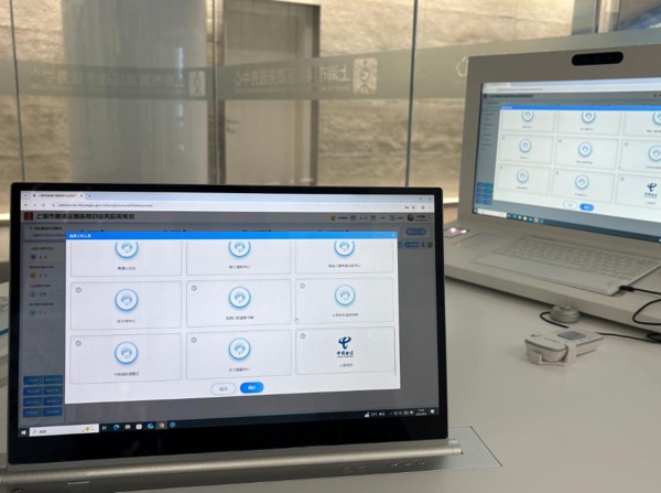 在D区的透明办公间里,一台主机搭配了四块电子屏,颇为引人注目。主机屏幕上显示着上海市黄浦区智能帮办业务应用系统,四块电子屏可以同步转接主机实时画面,为企业上门群体一键展示应用服务。一个个蓝色的图标代表着不同的服务部门,电信作为其中紧密嵌入的一环,通过线上线下相结合的方式,为企业提供高效服务。