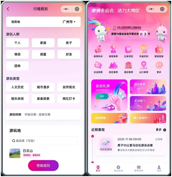 赛场内外,服务持续在线。面向公众的“全运通”平台,在天翼云的算力加持下,为观众提供从AI导览、赛事追星到“吃住行游购娱”的全链路智慧体验,让观赛更智能、生活更便捷。