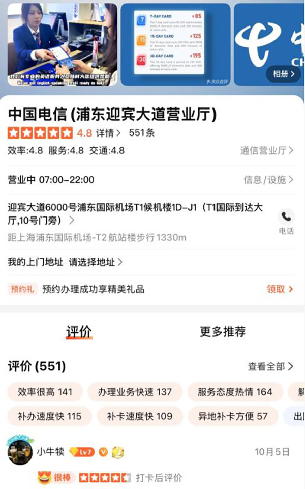 自2025年1月正式营业后,4月同步开启“大众点评”平台的运营,如今这里已成机场里的“网红服务点”:550多条好评、4.8高分、便民服务星级排名稳居前1%,更是上海通信运营商中评分第一的营业厅。