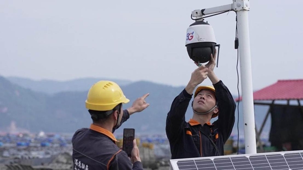 时下正值霞浦大黄鱼放苗关键期。海面上渔排连片,养殖户忙着投放鱼苗,中国电信宁德分公司装维人员穿梭其间,为渔民调测网络和天翼AI摄像头。