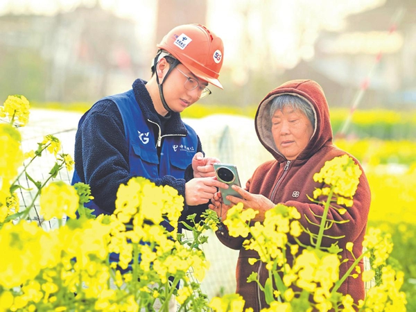 近日,中国电信江苏洪泽分公司营维人员利用“春季大促”契机,深入镇区村组,走进田间地头,开展反诈宣传,帮助农民捂紧“钱袋子”。图为中国电信洪泽分公司营维人员在田间向农户介绍国家反诈中心APP。