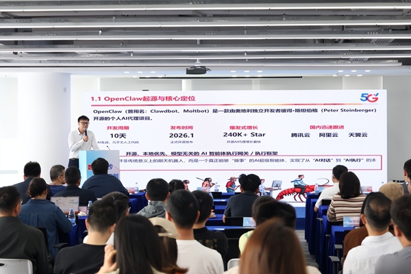 在主题分享环节,中国电信广州分公司围绕《南沙街万兆光网建设情况》《天翼云+OpenClaw企业级一体化部署方案》两大主题,讲解了万兆光网的技术优势、覆盖范围、应用场景及未来扩容规划,彰显高速稳定网络底座对数字产业发展的坚实支撑,引发现场热烈反响。