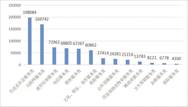 在具体服务投诉中,投诉量居前五位的分别为:经营性互联网服务、移动电话服务、餐饮服务、培训服务、住宿服务。