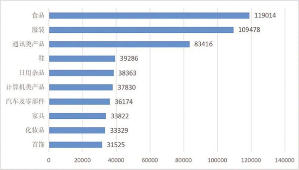 在具体商品投诉中,投诉量居前五位的分别为:食品、服装、通讯类产品、鞋、日用杂品。