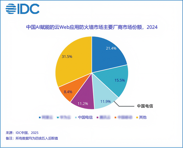 6月16日,国际权威咨询机构IDC发布《中国AI赋能的云Web应用防火墙市场份额,2024》报告,中国电信首次参评即以11.9%的份额跃居市场前三,以“云网融合”基因重塑Web安全防线。