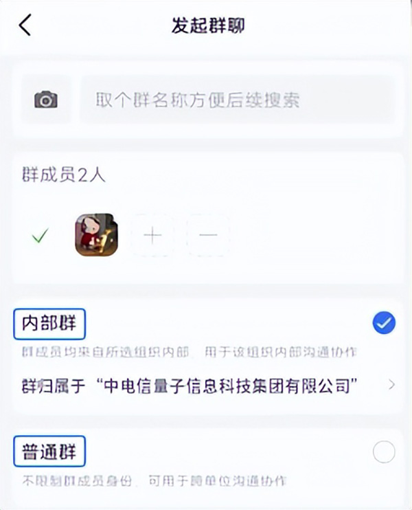 和普通社交软件不同,量子密信的群聊在创建时即可选择“内部群”或“普通群”,“内部群”仅支持邀请本组织内成员,避免通讯录同名同姓拉错群的尴尬,降低了外部人员被拉进重要讨论群的风险,特别适合部门协作、项目组沟通。