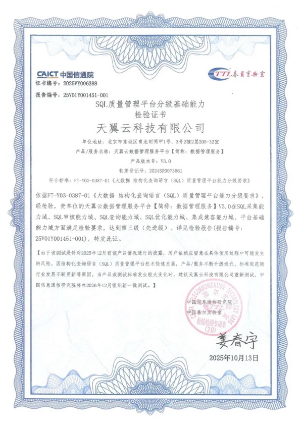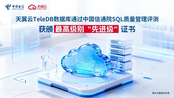 本次通过先进级评测,充分体现了天翼云TeleDB数据库在SQL质量管理与技术支撑方面的领先能力。未来,天翼云TeleDB数据库将以稳定可靠的数据库内核、卓越的查询优化性能和完善的生态兼容性,为企业在数字化转型中提供高标准、高性能的数据管理基座,助力企业构建安全、高效、规范的数据库管理体系,护航企业行稳致远。