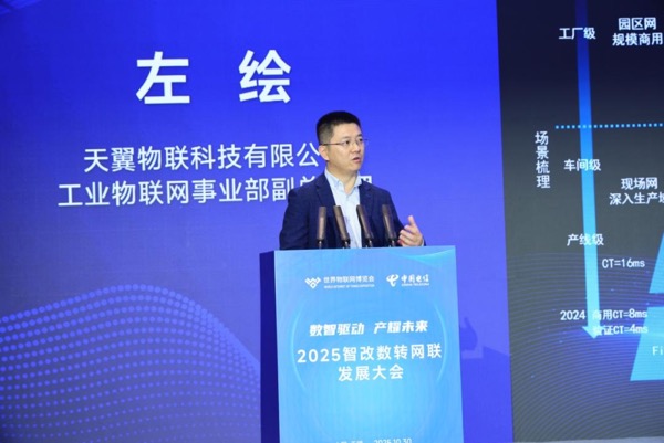 在2025物博会“智改数转网联”发展大会上,天翼物联工业物联网事业部副总经理左绘分享了工业确定性网络赋能企业数智化的成效。