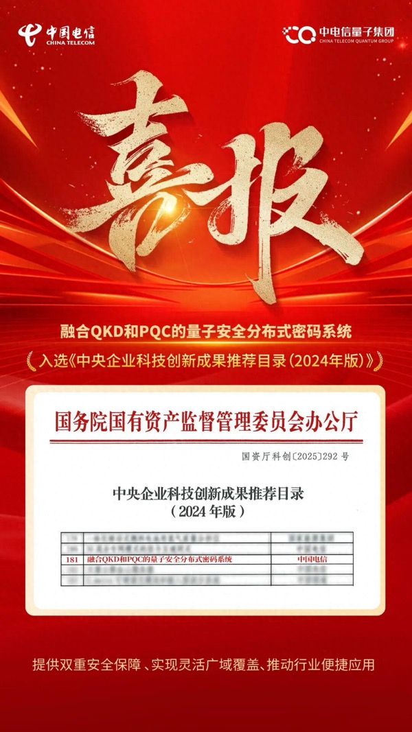 近日,国务院国资委正式发布《中央企业科技创新成果推荐目录(2024年版)》,中国电信自主研发的“融合QKD和PQC的量子安全分布式密码系统”成功入选,充分认可了中国电信在量子科技领域的前瞻性战略布局和自主核心技术攻关的创新能力。