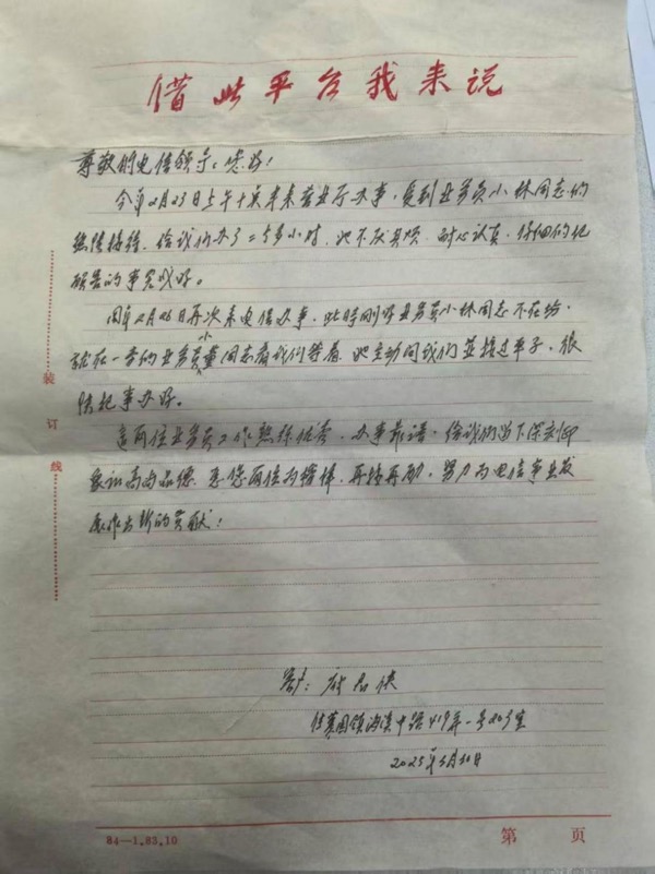 在春日的嵊泗海岛,中国电信嵊泗分公司中心厅收到了一封带着海风温度的表扬信。信中,用户用细腻的笔触记录了两次与营业厅的温暖邂逅,让董芷余店长与林妮妮营业员的服务故事如春日暖阳,照亮了“以心相伴”的服务征程。