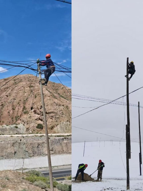 与此同时,在平均海拔4000米以上的塔什库尔干县红其拉甫口岸,严寒是另一种考验。这里的含氧量不足平原地区的一半,年平均气温仅3.3℃,极端低温可达零下40多摄氏度。六月突降的暴雪,让维护工作变得异常艰难。中国电信新疆长途传输局喀什分局的维护人员顶着刺骨的寒风和漫天飞雪,在能见度极低的环境下艰难行进。高原稀薄的空气让每一次呼吸都变得费力,简单的动作也会导致心跳加速、体力迅速消耗。严寒甚至剥夺了基本的补给——自热米饭因沸点过低难以煮熟,连生火做饭都成了难题。维护人员们裹紧衣帽,用冻僵的手拨开厚重的积雪,仔细检查每一段光缆、每一座杆塔。发现杆塔因积雪倾斜、光缆挂钩脱落或吊线松动等隐患,他们立刻投入抢修:冒着风雪攀爬冰冷的杆塔进行加固作业,挥动铁镐、铁锹挖掘坚硬如铁的冻土修复基础。每一次上杆,每一次挖掘,都是对体力和意志的极限挑战。