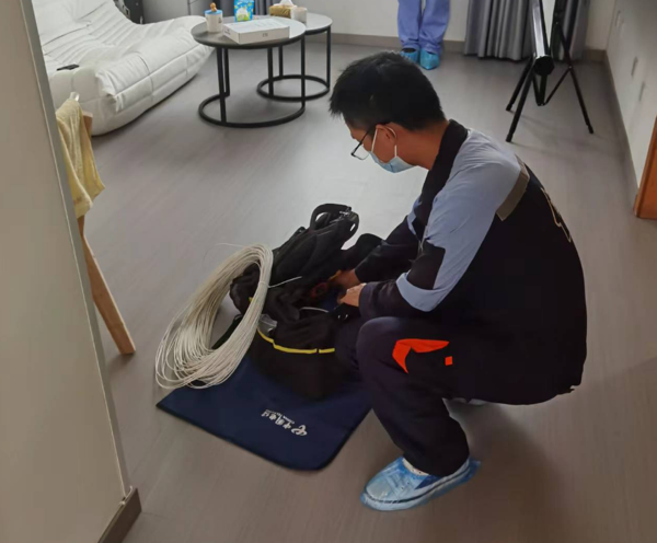 到达新址后,刘建霜先是查看好设备摆放位置和预埋网线接口,随后将光猫、网关稳稳固定在墙角,再把网线穿进预埋管道,确保线路整齐利落。为了做到网络覆盖无死角,他一手举着测速器,一手拿手机,逐个房间测试信号稳定性。