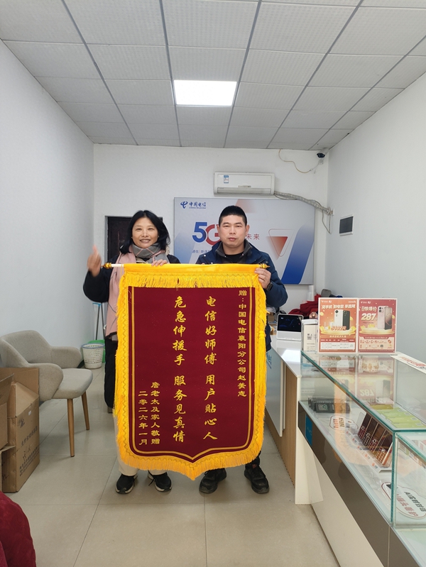 2026年1月14日,老人三个女儿为赵美志送上锦旗,上面写着“电信好师傅用户贴心人,危急伸援手服务见真情”。大女儿哽咽道,赵师傅伸出的是救命稻草,是她们无助时的安心。