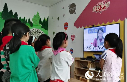 “爱心小屋”位于花竹村校图书室,内有宽带接入电视,不仅可在小屋内组织在线学习和互动活动,还能通过“渝眼APP”让学生与外出打工的父母视频在线交流。