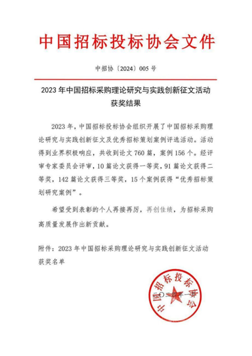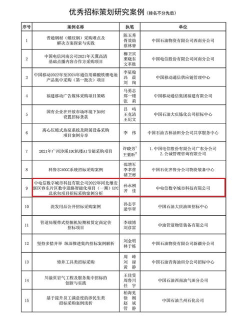 2023年,中国招标投标协会组织开展了中国招标采购理论研究与实践创新征文及优秀招标策划案例评选活动。活动得到业界积极响应,共收到论文760篇,案例156个。经评审专家委员会评审,中电信数城科技公司提报的“2022年河北雄安新区容东片区数字道路智能化项目(一期)EPC总承包项目招标采购案例”在内的共15个案例入选“优秀招标策划研究案例”。