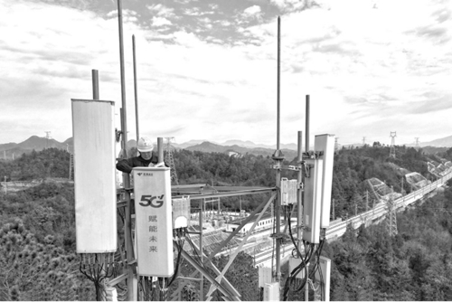 安徽黄山电信坚守为民服务初心,充分利用5G、光宽、大数据等技术,加强偏远山区新型信息基础设施建设与信息化应用推广,服务乡村特色产业发展,让“新农人”享受高铁带来的便利的同时,也能感受到5G信息高速路的畅通和便捷。图为安徽黄山电信无线网维护人员正在杭昌高铁途经的祁门县祁山镇华桥村基站进行天馈调整,优化5G网络。