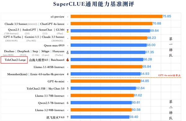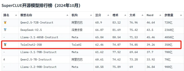 在本次参选SuperCLUE10月榜单的43个大模型企业中,TeleAI是唯一的央企大模型机构,同时TeleChat2系列大模型是基于全国产化万卡集群和国产深度学习框架训练完成。