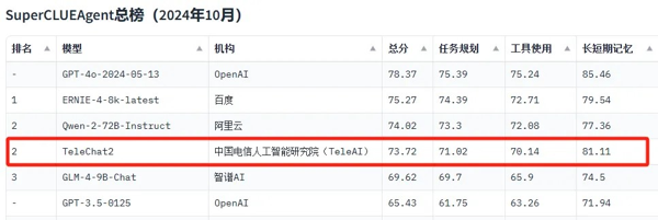 不仅如此,TeleChat2系列模型还完成了Agent能力建设,重点加强了模型在指令跟随、任务拆解、工具调用等方面的能力和表现。在10月的SuperCLUEAgent总榜中,TeleChat2排名并列第二。
