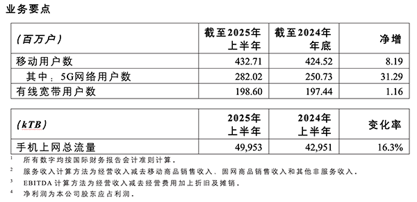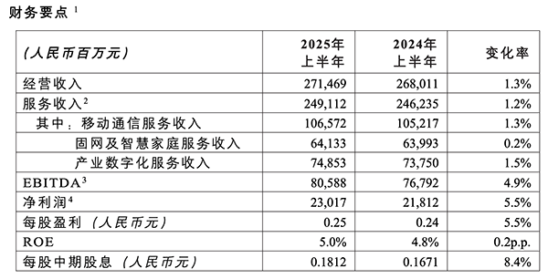 2025年上半年,公司经营收入为人民币2,715亿元,同比增长1.3%,其中服务收入为人民币2,491亿元,同比增长1.2%。EBITDA为人民币806亿元,同比增长4.9%。净利润为人民币230亿元,同比增长5.5%,每股基本净利润为人民币0.25元。资本开支为人民币342亿元。自由现金流为人民币131亿元,同比增长13.9%。