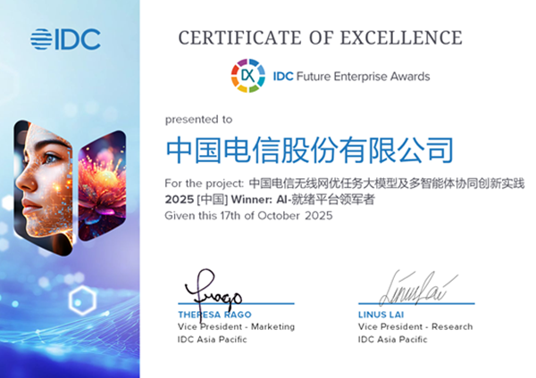 10月17日,在IDC(国际数据公司)“2025中国CIO峰会暨数字化转型年度盛典”上,中国电信“无线网优任务大模型及多智能体协同创新实践”项目,凭借前瞻技术架构与规模化应用成果,在“AI就绪平台领军者”赛道中荣获卓越奖,该奖项为该赛道最高荣誉,仅设一席,充分展现中国电信在人工智能核心能力上达到国际先进水平。