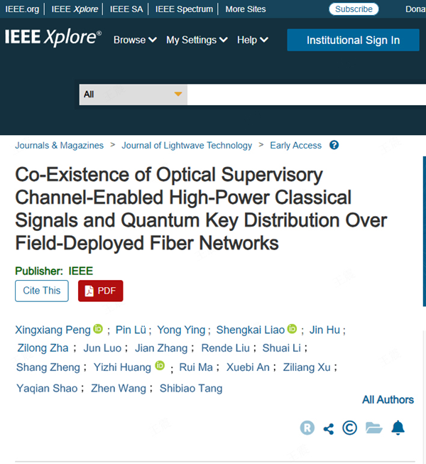 近日,中国电信量子研究院再添一项国际权威认可。该院团队首次实现超过80km的10Tb/s以上经典光信号与离散变量量子密钥分发(DV-QKD)共纤传输现网实验,该成果已被光通信领域国际期刊《Journal Of Lightwave Technology》正式收录。