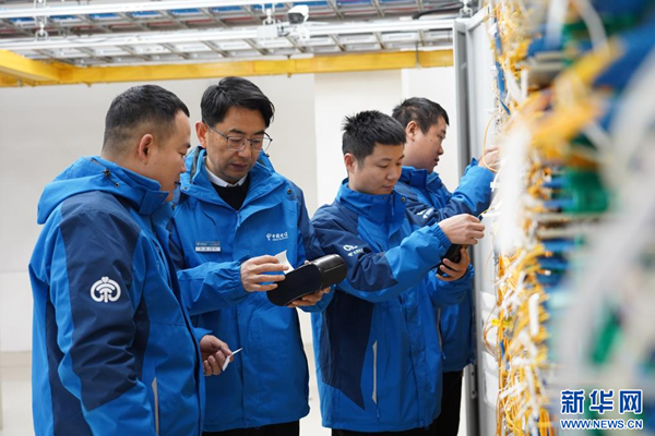 宗强(左二)与他的团队在机房调试数据。新华网 王中庆 摄