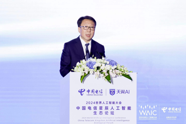 7月5日,在世界人工智能大会暨人工智能全球治理高级别会议期间,中国电信星辰人工智能生态论坛成功举办。中国电信总经理梁宝俊作题为《星辰注智,共创共享,领航产业智能新变革》的主旨演讲。