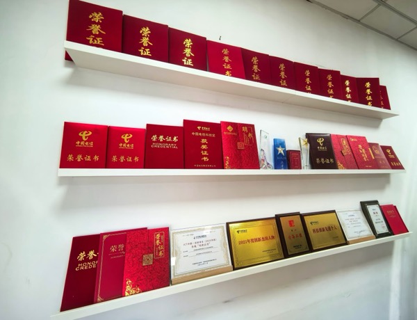 走进中国电信山东青岛分公司周江创新工作室,获奖证书“涂红”的一整面墙不仅让我们看到科技创新中“人”的不可替代性和主体性,也印证了中国电信云网融合赋智千行百业的理念。