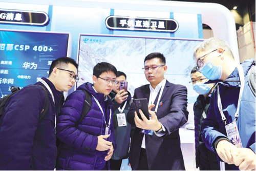在“5G新通信”展区,观展者驻足体验中国电信自研手机的卫星通信功能。2023年9月,中国电信推出手机直连卫星业务,成为全球首家实现地面蜂窝网与卫星网融合的电信运营商,用户在偏远户外、森林、沙漠、高山、海洋等移动网络覆盖不到的地方,或遭遇洪水、地震等自然灾害,手机直连卫星业务将成为应急通信最主要的手段。