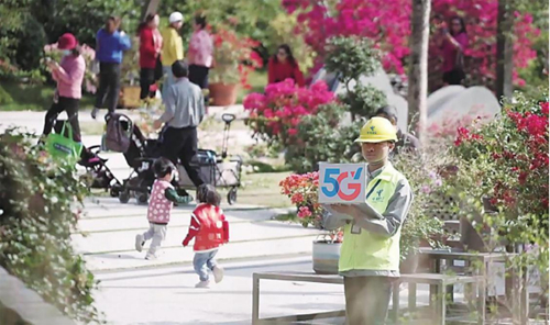 在莲花山簕杜鹃花展期间,深圳电信工作人员在如织人流中进行园区信号覆盖测试,保障用户体验。