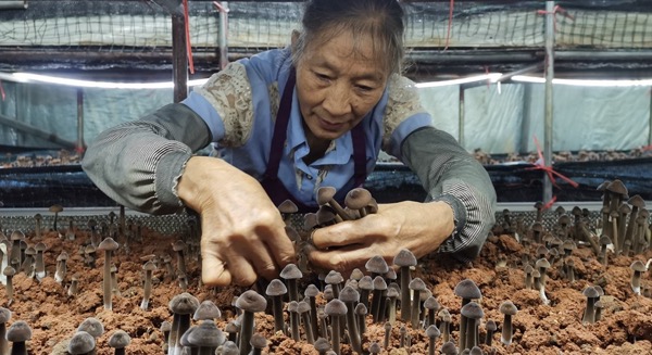 灌阳县观音阁乡海山食用菌产业基地的工人在采摘黑皮鸡枞菌。