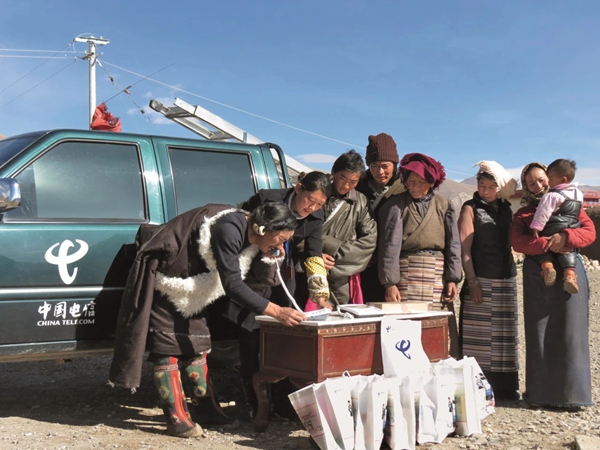 西藏电信员工(左二)指导当地牧民开通电信网络。