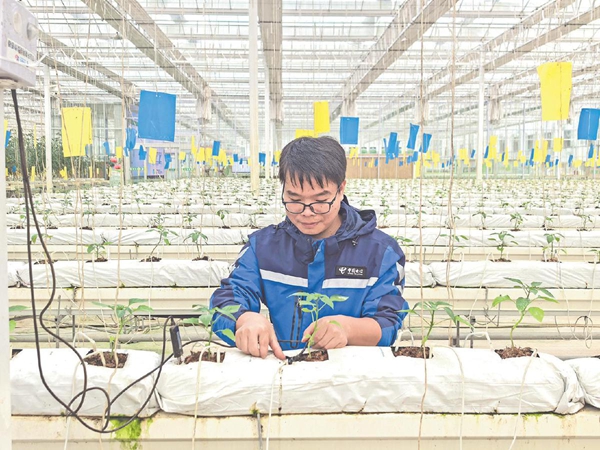 图2:在广西南宁晟发蔬菜基地,中国电信工作人员在大棚内调试滴灌设备。