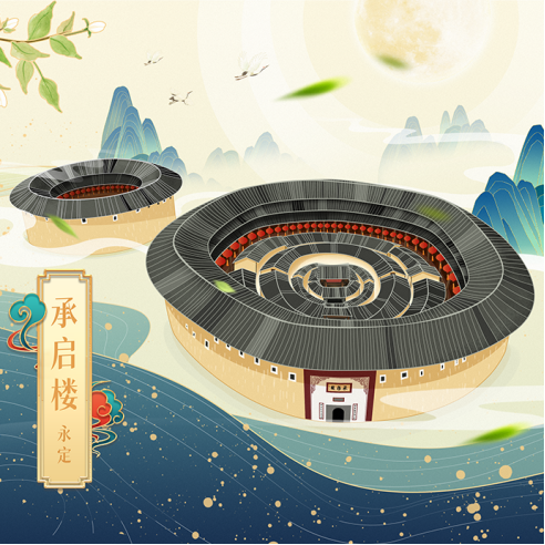 承启楼位于福建省龙岩市永定区,始建于明崇祯年间,建成于1709年,距今已过300年,是全国重点文物保护单位。以承启楼为代表的福建土楼于2008年列入《世界遗产名录》。1986年发行的“中国名居”邮票中福建民居的画面就是承启楼。 作为代表福建龙岩永定的土楼文化的名片,我们选取了“承启楼”来作为数字艺术藏品的主要内容再配上偏水墨的国风画风,将土楼本身的特点和中国特色融合在一起。