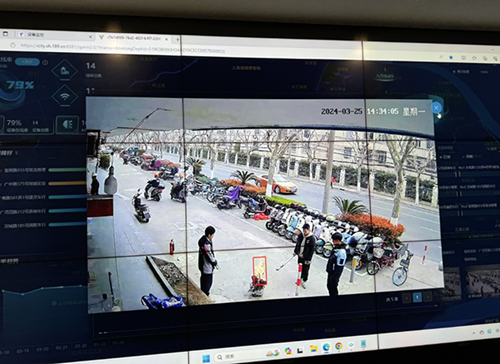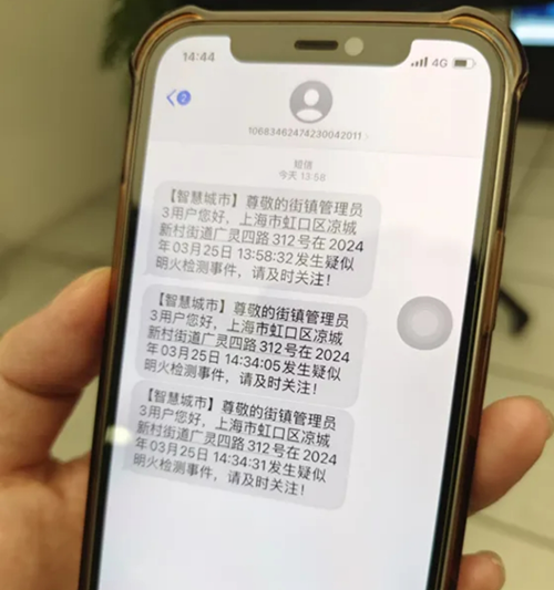 3月25日下午两点,凉城新村街道广灵四路某电动自行车销售点门前突发“火情”,火借风势,越烧越旺。第一时间,六公里之外的凉城新村街道社区城运中心内的大屏幕上,弹出告警信息,街道管理人员和该电动自行车销售点店主同时收到手机短信提醒,告知发生疑似明火事件,提醒及时进行处置。