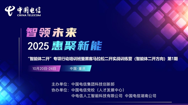 2025年“智能体二开”专项行动培训班暨黑客马拉松二开实战训练营(智能体二开)第1期于10月20日在重庆正式开班。本次培训由中国电信集团公司科技创新部主办,联合中国电信党校、中电信人工智能科技有限公司、中国电信湖南公司共同协办,采取主——中国电信集团、实——中国通信服务股份有限公司、专——中电信人工智能科技有限公司三体协同的创新赋能模式,吸引了来自全国28个省市及中通服的145名学员参与。培训以“训-战-评”一体化闭环模式,结合线上线下教学,旨在通过实战实训提升学员在智能体二次开发方面的能力,推动AI技术规模化应用与人才队伍建设。