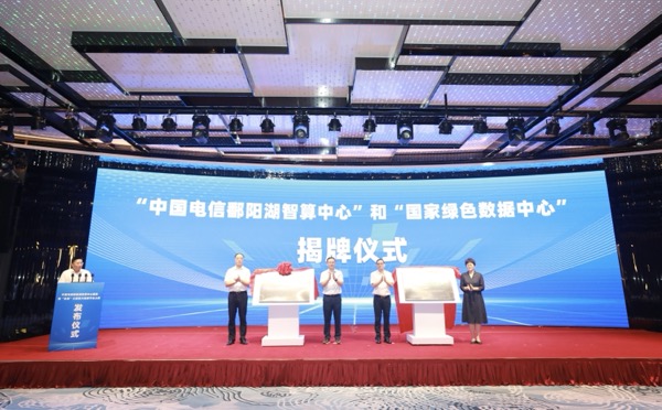 图三:九江市委书记刘文华,中国电信天翼云科技有限公司董事长、总经理胡志强出席“中国电信鄱阳湖智算中心”暨“国家绿色数据中心”揭牌仪式
