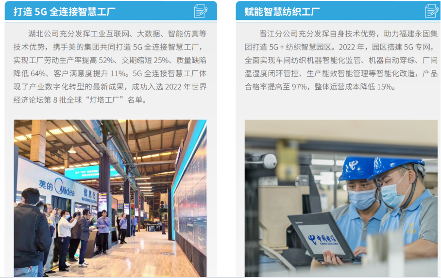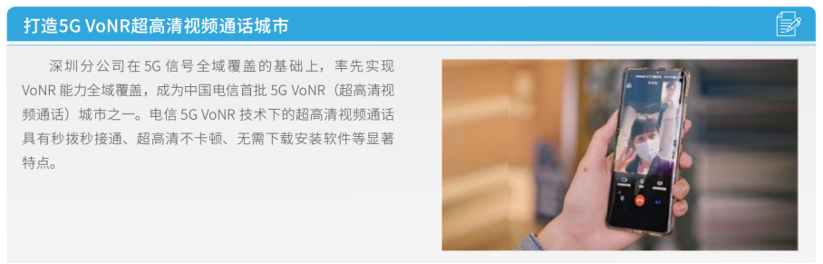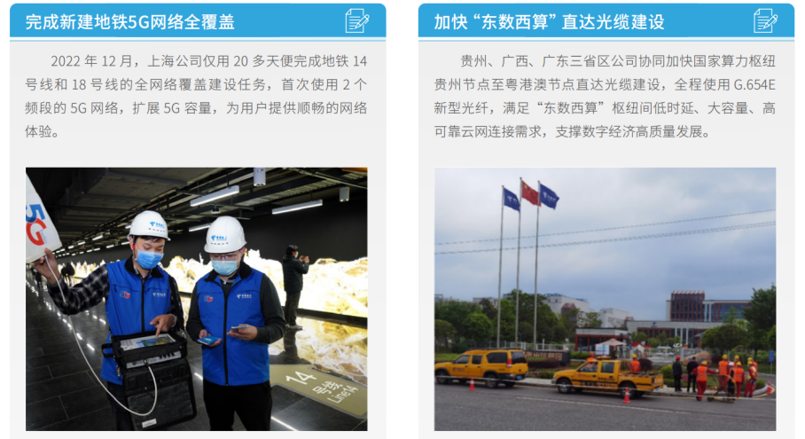 中国电信加快双千兆网络建设。移动网方面,全面建成了全球首张规模最大、网速最快的5G SA共建共享精品网络, 开通5G共享基站100万站,实现高中低多频协同等技术突破,基本实现发达乡镇以上区域的室外连续覆盖、高流量行政 村热点覆盖、中高业务场景的室内深度覆盖,为全球5G SA部署提供了应用示范。宽带网方面,建成全球最大的千兆光 网,新建10G PON端口297万个,千兆光网覆盖超过2.9亿家庭住宅,有效支撑千城千兆业务发展。