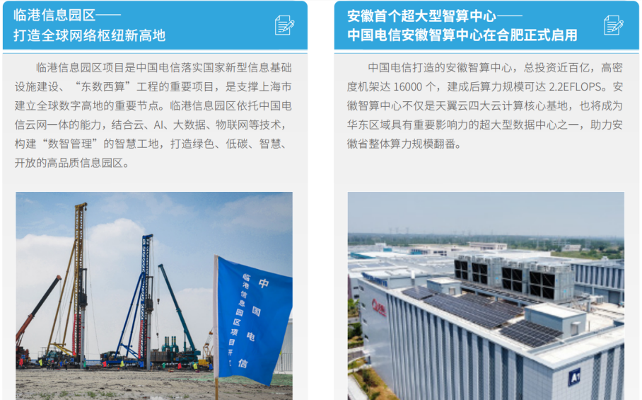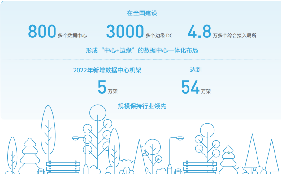 中国电信积极布局算力基础设施,在京津冀、长三角、粤港澳、成渝等区域中心节点,打造支持大规模、多可用 区的新一代云底座天翼云4.0,为用户提供高可用的云服务。在241个城市建设“一城一池”节点,为客户提供更好的数 据本地化、超低时延分布式云服务。强化行业专属云与客户私有云能力建设,为千行百业数字化转型打造安全可信的 云底座。在全国建设800多个数据中心、3000多个边缘DC和4.8万多个综合接入局所,形成“中心+边缘”的数据中心一 体化布局,2022年新增数据中心机架5万架,总规模达54万架,保持行业领先。