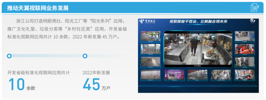 江苏公司积极推进省内智慧社区建设,打造镇江、南京、苏州三个智慧社区基地,有效搭建政府、物业和家庭三者之间的纽带,有力支撑全省智慧社区发展运营。2022 年省内签约9000个小区,新增标准智慧小区3697个,不断满足政府、社会、居民等群体的数字化需求。