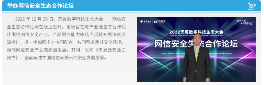 中国电信着力夯实高质量发展的安全基础,坚定维护网信安全,保障应急通信,多措并举防范化解重大风险。