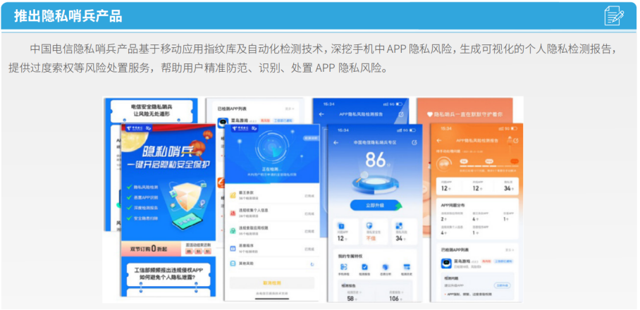 中国电信积极落实《中华人民共和国数据安全法》《中华人民共和国个人信息保护法》等法律法规要求,完善《中国电信用户个人信息保护管理办法》,保障用户个人信息处理活动中的安全和权益,深入推动APP侵害用户权益治理工作,积极探索分场景用户个人信息保护能力,建立企业重要数据和核心数据目录,提升风险自主发现能力,数据安全风险自发现率达到99.9%。积极开展个人信息保护行动,研发个人信息保护相关功能产品,切实做好用户个人信息保护服务。