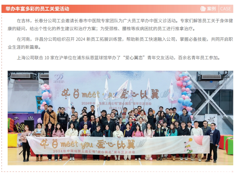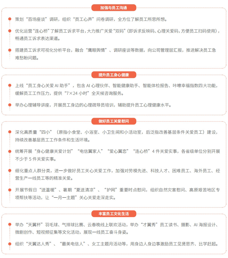 中国电信持续加强与员工沟通,了解员工诉求,积极解决急难愁盼问题,同时持续开展对员工的关怀慰问,提升员工身心健康水平,提高广大员工获得感、幸福感、安全感,营造和谐向上的良好氛围。