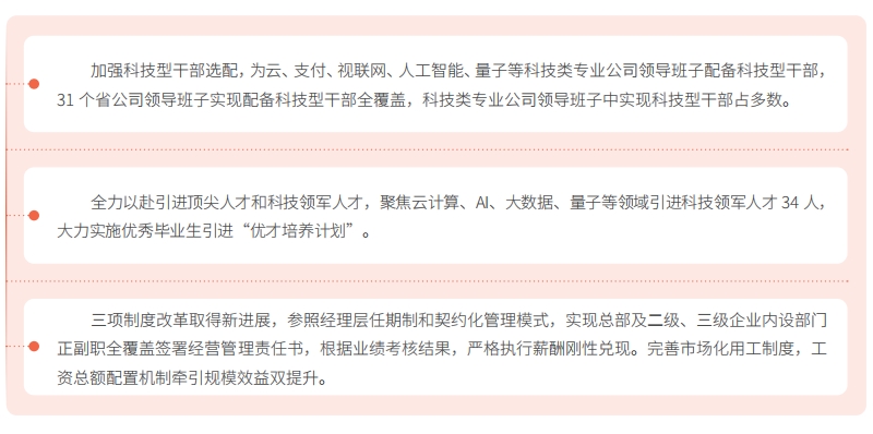 中国电信坚持人才是第一资源,深入实施人才强企工程,深化三项制度改革,全方位培养、引进、用好人才。