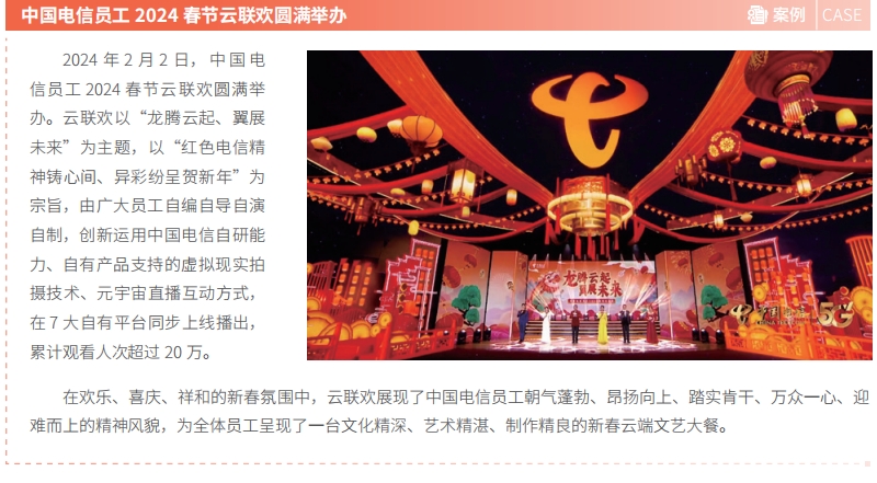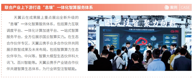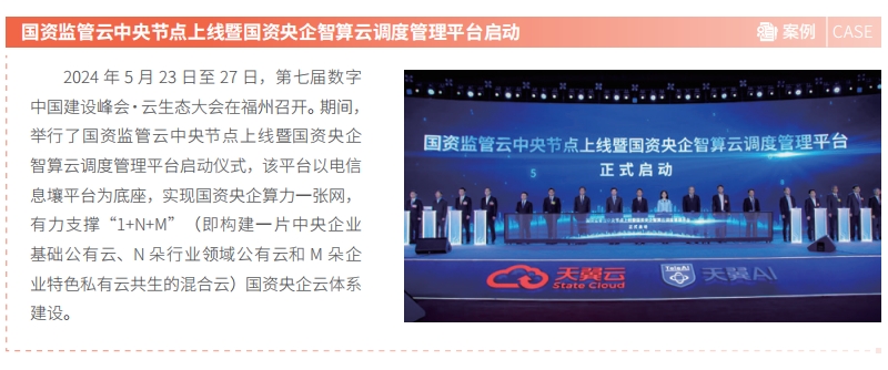 中国电信依托自身优势,聚焦战略性新兴产业和未来产业,统筹推进产业链高水平开放合作,持续发挥产业引领作用。在第七届数字中国建设峰会·云生态大会期间,发布算力伙伴共赢计划和模型伙伴繁荣计划,诚邀产业链伙伴共建算力、模型两大生态体系;在国务院国资委指导下,携手 50 余家创新主体举办“云创智汇”云计算创新联合体行动。大会所构建的繁荣生态合作系列举措,充分展示了国资央企以科技创新推动产业变革,强化产业引领控制的成果,获得产业界广泛响应。