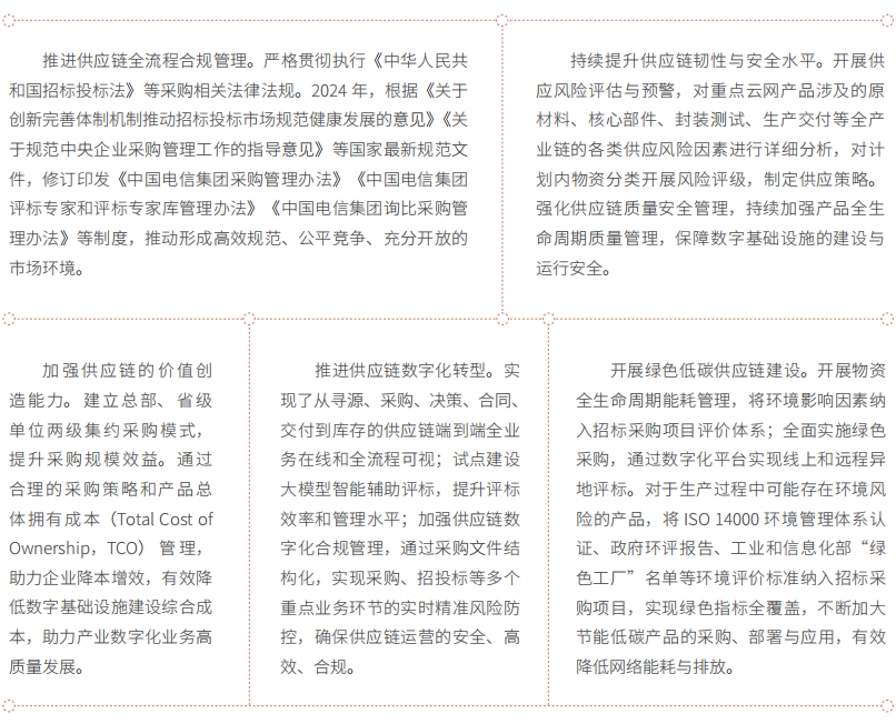 中国电信高度重视供应链对社会和环境的影响,将可持续发展理念融入供应链管理全过程。坚持建设韧性安全、价值创造、数智赋能、绿色生态、依法合规的供应链管理体系,有效避免和应对各类供应链风险,保障供应链安全稳定。